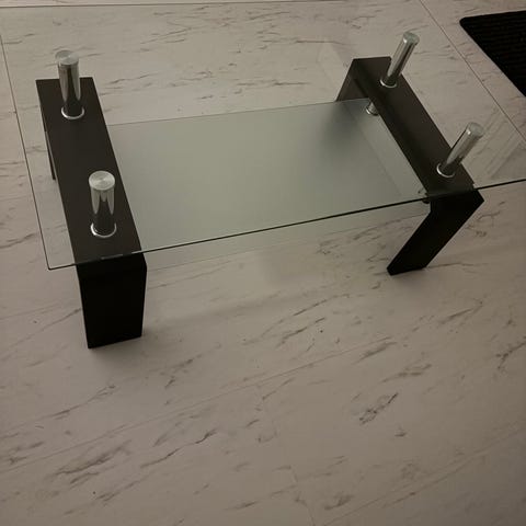 Myydään lasinen sohvapöytä. Pöydässä kaksitaso, jotka ovat liikuteltavat. Pöydän alemmassa tasossa on pyörät. Yksi pyöristä on rikki, mutta vaihtopyöriä saa ostettua. Ei ole oikeastaan meidän käyttöä haitannut. Tason saa purettua pienempiin osiin, joten kuljettaminen on todella helppoa.
