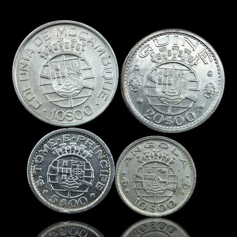 Portugalin siirtomaat - Angola, Mosambik ja São Tomé ja Príncipe. 3 × 5 escudos + 5 escudos + 4 × 2,50 escudos, hopeaa (31,95 g) puhua