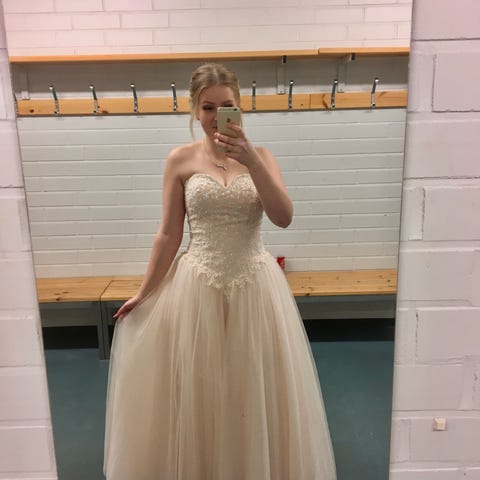 Myydään upea, vaalea kullan/beigen sävyinen Ruby Prom -mekko. Mekossa on runsaasti kauniisti kimaltelevia paljetteja yläosassa sekä ilmava, näyttävästi laskeutuva tyllihame.