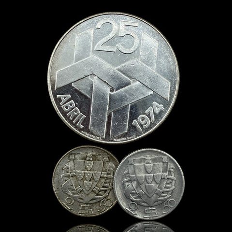 2,50 Escudos1932–1951Kolikot › Tavalliset liikkeessä olevat kolikot: System 1927-1968Prata 650‰ • 3,5 g • ⌀ 20,5 mmKM# 580, Gomes# R 30, N# 37101000 escudoja (Pauliteiros Dancers)1997Kolikot › Kiertävät juhlakolikot: System 1981–2001 – PauliteirosHopea 500‰ • 28,2 g • ⌀ 40,1 mmKM# 704, Gomes# R 161, N# 11120