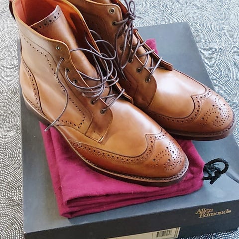 Upeat Aldenin hevosennahkaiset broguekengät. Käytetyt mutta hyvässä kunnossa. Koko US 10 ja lesti C/E, vastaa eurokokoa 43,5. Itselle hieman isot niin eivät ole tulleet käyttöön. Laitan seetripuiset lepolestit (ei Aldenin omat) mukaan koska näitä ei kannata muuten säilyttää.