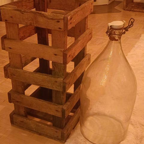 Jonkinlainen valmistusvirhe pullossa seisoo vinossa.