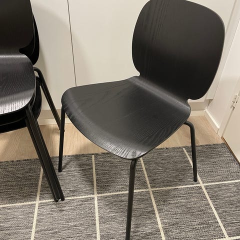 Ikea Bernhard tuolit, joissa on musta istuinosa ja metalliset jalat. Tuolit ovat yksinkertaisia ja modernin tyylisiä, sopien monenlaisiin sisustuksiin.