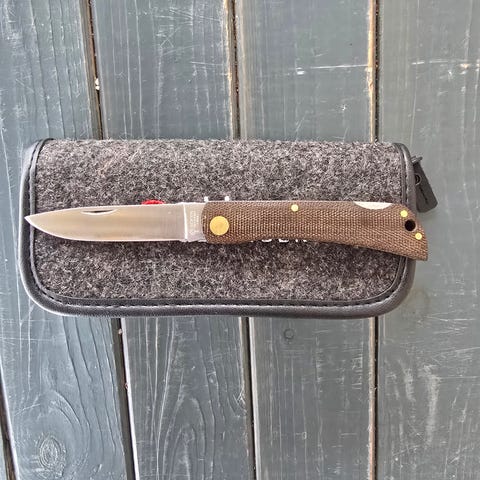 White River Knife and Tool Sendero Classic in mirror finished S35vn steel, black/green burlap micarta and a beautiful leather sheath.