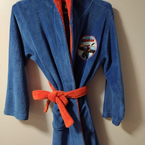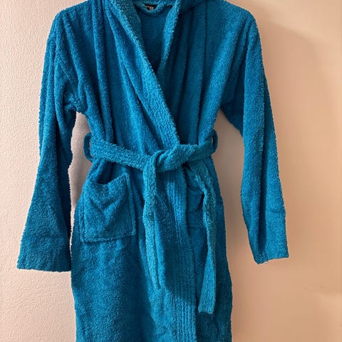 Myydään hyvin vähän käytetty, erinomaisessa kunnossa oleva sininen saunatakki / kylpytakki. Koko on 140 cm, materiaali fleece. Ostettu Prismasta, House-merkkinen.