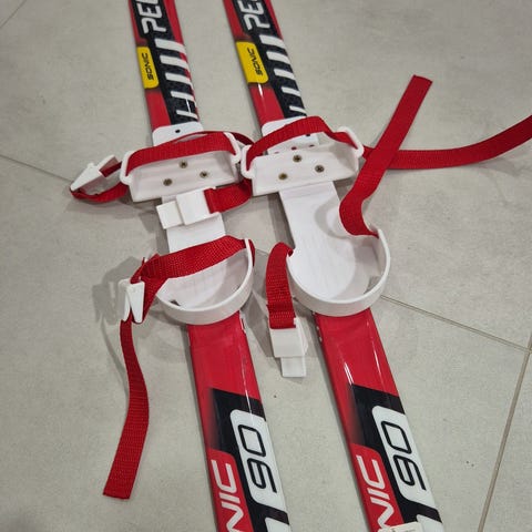 Kenkiin kiinnitettävät sukset pienimmille. Pohjassa pitoalue. Pituus 90-95 cm.
