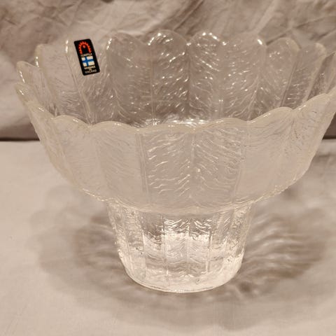 Hyväkuntoinen ja ehjä lasimalja. Halkaisija noin 22.5 cm ja korkeus noin 16.5cm. Nouto Joensuu tai postitus.