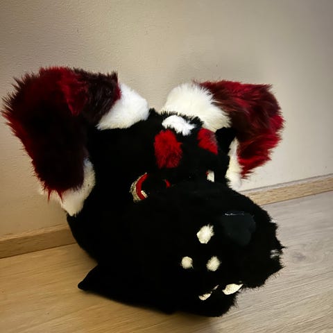 Käsintehty fursuit pää. Ei hirveän taidokas, mutta toimii tarkoitusessaan. Vaahtomuovi kehys. Korvissa samaa pastellin väristä kangasta kuin hännässä. Toisen korvan sisä kangas hieman irti. Hännässä hakaneulalla sulkeutuva vyö. Melko kapealle vyötärölle, mutta pystyy säätämään.