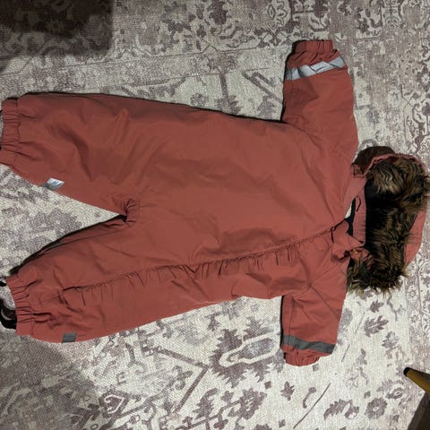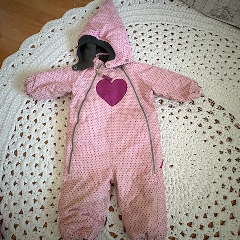 Kaunis sydän toppapuku suojaavalla hupulla. Koko 74.