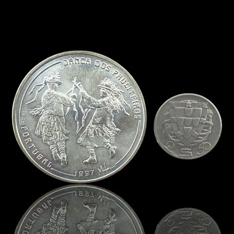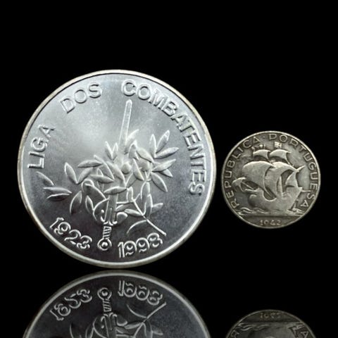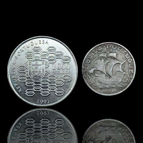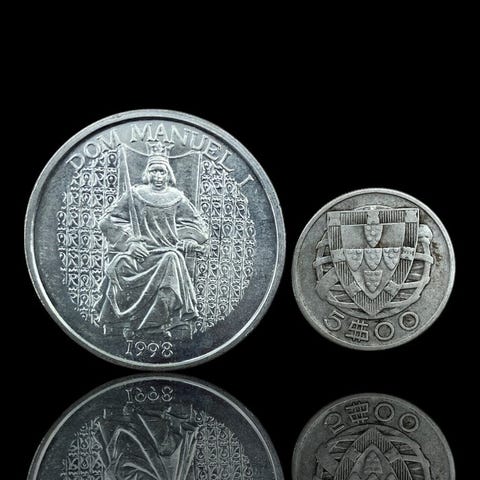 1000 Escudos (Kahden maailman kohtaaminen)S.D. (1992)Kolikot › Kiertävät muistokolikot: Järjestelmä 1981–2001 – Kahden maailman kohtaaminenPrata 500‰ • 27 g • ⌀ 40 mmKM# 657, Gomes# R 154, N# 154632,50 Escudos1932–1951Kolikot › Tavalliset liikkeessä olevat kolikot: System 1927-1968Prata 650‰ • 3,5 g • ⌀ 20,5 mmKM# 580, Gomes# R 30, N# 3710