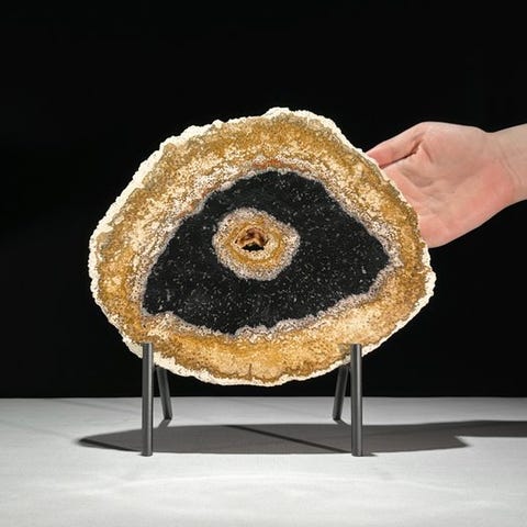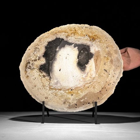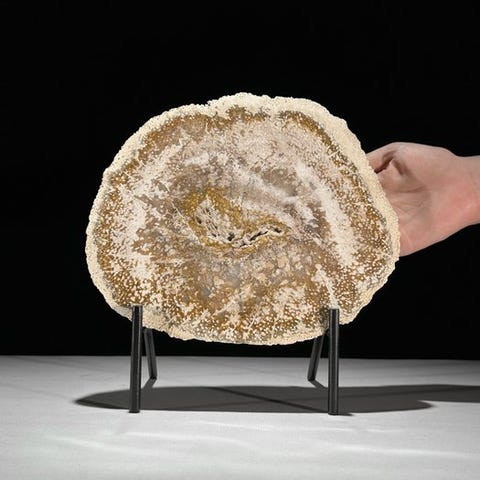 Upea pala muinaistunutta palmujuurta räätälöidyllä jalustalla.Kaunis viipale fossiilipalmun rungosta, jossa on upeita sävyjä ja tyypillinen puhkeama. Kuori on selvästi näkyvissä ulkopuolella, ja palmujen tyypillinen muodostuma erottuu keskellä. Osan sisäosasta on geodetisesti kiteytynyt. Viipale on erittäin kauniisti kiillottu, mikä tekee yksityiskohdat näkyviksi.Likimääräiset mitat - jalustan kanssa:#Korkeus: 29 cm, Leveys: 34.8 cm, Viipaleen paksuus: 1.7 cmNoin mitat - ilman jalustaa:# Korkeus: 25 cm , Leveys: 34.8 cm, Viipaleen paksuus 1.7 cmVastuuvapauslauseke- Huomioithan, että yksi kuvista on otettu hämärässä studiolla, ja värit voivat vaihdella ympäristön mukaan.Paino, joka mainitaan, sisältää pakkausmateriaalin.LähetysKohde lähetetään seurantanumerolla DHL Parcelin, DPD:n tai postNlin kautta. Seuranta päivittyy Catawiki-luettelossasi, kun pakettisi on jätetty postiin.Ole hyvä ja tarkista säännöllisesti välttääksesi pakettisi palautumisen meille, jolloin ostaja vastaa toisen lähetyksen toimituskuluista.Seurantaan Espanjaan ja Portugaliin käytä tätä linkkiä ja lisää Catawiki-erästäsi saatu seurantanumero.https://clientesparcel.dhl.es/LiveTracking/HomeME EMME YHDISTÄ TOIMITUKSIA!!!Jos sinulla on kysyttävää paketistasi, ota meihin yhteyttä Catawiki-viestipalvelun kautta. Pyrimme vastaamaan kolmessa työpäivässä.