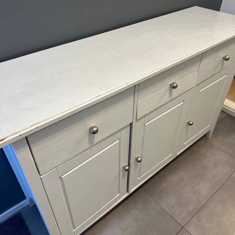 Näppärälle tästä kunnostusprojekti! 50/60- luvun(?) tiikkiviilu(?) senkki, josta puuttuu kokonaan jalat, joille on pohjassa ruuvipaikat. Päällysosassa vesitahroja eli vaatii hiomisen ja uuden mehiläisvahauksen tai maalauksen. Liukuovet, joissa kauniit messinginväriset kahvat. Keskiosa maalattu tummanharmaaksi/mustaksi, reunoissa kiinteät hyllykannattimet.
