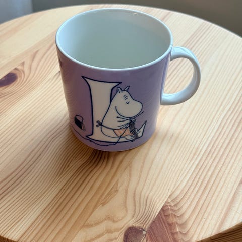 Arabia Muumi muki, jossa keltainen tausta ja Pikku Myy sateenvarjon kanssa. Posliininen materiaali.
