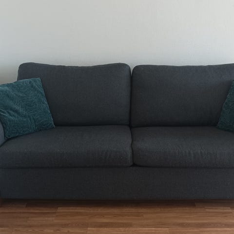 Kolmen istuttava jämäkkä siistikuntoinen sohva. Ehjät, irrotettavat ja pestävät päälliset, kestävä kangas. Istuinsyvyys 54 cm.