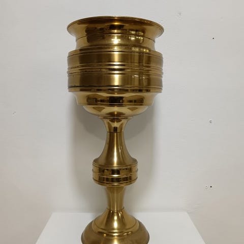 Erän kuvaus (Vintage messingin jäähdytin/ruukku)Elegantti messinkinen samppanjanjäähdytin tai jalustallinen ruukku, jossa leijonanpääkahvat.Tekijä/koulu: Anonyymi, eurooppalainen valmistus (yleisesti ranskalainen tai italialainen), 20. vuosisata (n. 1960–1980). Tyylisuuntaus sijoittuu neoklassiseen tai Hollywood Regency -tyyliin.Tekniikka ja tuki: Valmistettu kokonaan kiillotetusta messinkistä. Siinä on klassinen muoto, jossa on yläkulho ja korkea jalusta, joka erottaa sen tavallisista jääpalamuoteista. Koristeena renkaankahvat ja leijonankuvioita.Teema: Monikäyttöinen koriste-esine, joka toimii samppanjapullon jäähdyttimenä (champagne bucket) tai tyylikkäänä seisovana ruukkuna/istutusruukkuna.Toimenpiteet:Kokonaismitat: 54 cm (korkeus) x 26 cm (leveys/kulhon suurin halkaisija).Kuntoarvio: Kappale on yleisesti hyvä vintage-kunto, jossa on käytön ja kulumisen merkkejä, jotka ovat normaaleja sen iän huomioiden. Messinkillä voi esiintyä luonnollista patinaa tai kevyitä pintajälkiä, mikä on tyypillistä tälle materiaalille. Suositellaan tarkastelemaan korkearesoluutioisia kuvia yksityiskohtaista arviota varten.Lisätiedot: Tämä on veistoksellinen ja erittäin haluttu teos, jota arvostetaan sen tyylikkään suunnittelun ja toiminnallisuuden vuoksi. Se on erinomainen lisä tuomaan tilaan hienostuneen kosketuksen.