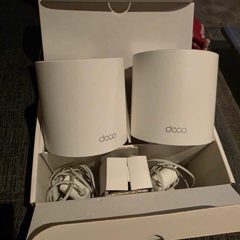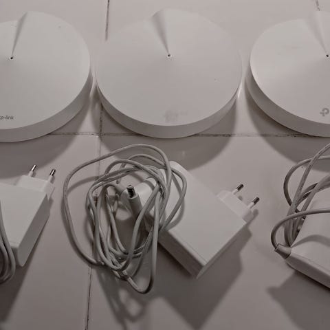3 kpl TP-Link Deco M9 plus mesh -yksikköä. Näillä saa muodostettua laajan yhtenäisen wifi-verkon kotiin.