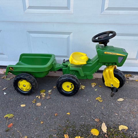 Rolly Toys John Deere -polkutraktori kauhalla ja peräkärry sekä John Deere -vesisäiliövaunu.