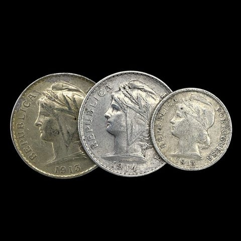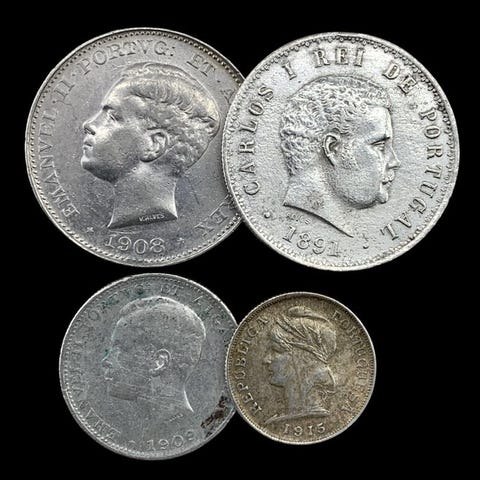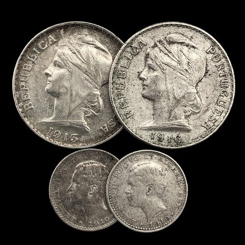 Portugal4 hopeakolikoita (1x 10 Centavos + 1x 50 Centavos + 1x 2.50 Escudos + 1x 10 Escudos) - 31 g1912/1915/1940/194450 centavos - 19121912–1916Kolikot › Tavalliset kierrossa olevat kolikot: järjestelmä 1912-1916Silver (.835) • 12,5 g • ⌀ 30 mmKM# 561, Gomes# R 18, N# 928410 Centavos1915Kolikot › Tavalliset kierrossa olevat kolikot: järjestelmä 1912-1916Kultasilver (.835) • 2,5 g • ⌀ 20 mmKM# 563, Gomes# R 07, N# 1115010 Escudos - 19401932–1948Kolikot › Standardikäteiskolikot: Järjestelmä 1927-1968Silver (.835) • 12,5 g • ⌀ 30 mmKM# 582, Gomes# R 43, N# 111572,50 Escudos - 19441932–1951Kolikot › Standardikäteiskolikot: Järjestelmä 1927-1968Hopea (.650) • 3,5 g • ⌀ 20,5 mmKM# 580, Gomes# R 30, N# 3710{ToimitusilmoitusHuomaa, että emme tarjoa yhdistettyä toimitusta. Jokainen ostettu tuote lähetetään erikseen, ja jokaiselle tilaukselle sovelletaan erillisiä toimituskuluja.Tämä politiikka mahdollistaa huolellisen käsittelyn ja nopeamman, turvallisemman toimituksen jokaiselle osalle.Arvostamme ymmärrystänne ja olemme käytettävissänne mahdollisissa lisäkysymyksissä.