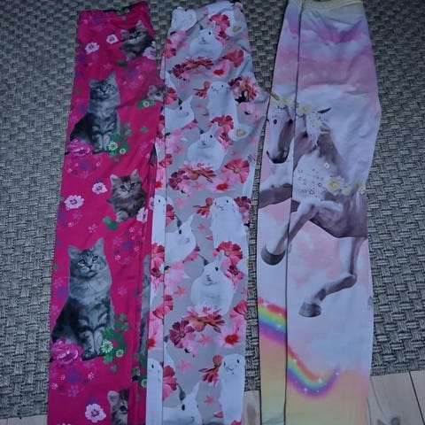 Myydään housusetti tytölle. Koko 134/140cm. Kahdet vasemmanpuoleiset collegehousuja ja mustat ohuemmat trikoohousuja. Merkki PomDeLux muissa paitsi liiloissa. Ostajalle mahdolliset postikulut.