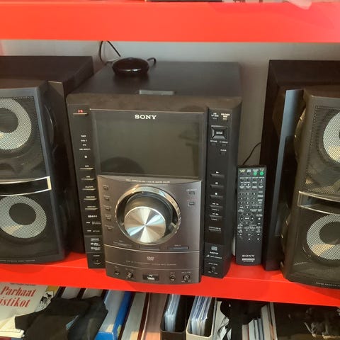 Mitat: korkeus: 24 cm, stereon leveys 15,5 cm, stereon syvyys 24 cm ja kaiuttimien leveydet 15 cm, kaiuttimien syvyys 13 cm. Vain nouto ja maksu käteisellä.