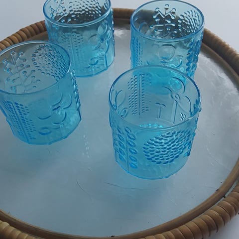 Oiva Toikan suunnittelemat siniset lasit. Korkeus 10,5cm / 2dl Virheettömät.
