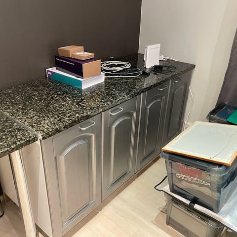 Mustaksi ulkoa maalattu metallikaappi.