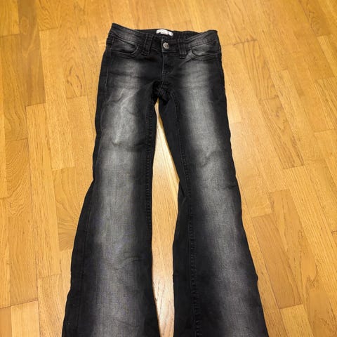 Tyylikkäät tummansiniset farkut, joissa lievästi levenevä lahje ja kulutetut yksityiskohdat. Ei käytönjälkiä – erittäin siistit ja hyväkuntoiset. Sopivat arkeen tai rennompaan menoon.