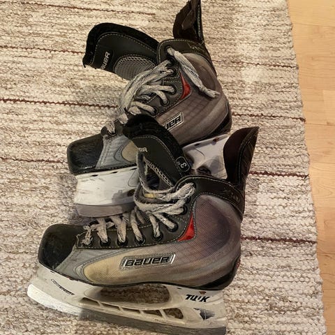Bauer jääkiekkoluistimet / hokkarit. Taulukon mukaan koko 3 = 36 mutta mielestäni lähempänä 35. Luistimissa on musta ulkokuori ja punainen sisävuori. Soveltuvat jääkiekkoon.