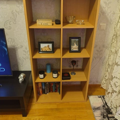 Valkoinen Vittsjö hylly. Yleisilme siisti. Yhdessä hyllylevyssä tummentumaa (näkyy kuvassa), saa piiloon vaihtamalla ylimmän ja alimman hyllylevyn paikkaa. Lasilevyissä naarmuja, kahdessa enemmän, ei ole kuitenkaan käyttöä haittaavia. Naarmuja en kuitenkaan saa kuviin näkyviin kovinkaan hyvin. Vain nouto!
