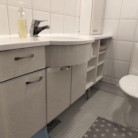 Kuvanmukainen mattavalkoinen Isku-keittiöiden kaapisto hidastin saranoilla (peili ei sisälly kauppaan), allastaso, Oras hana bideellä. Kunto siisti.