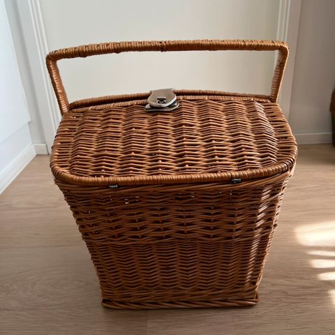 Kuvassa oleva uusi, käyttämätön rottinkinen picnic kori. 4 lautasta, 4 mukia (muoviset), metalliset aterimet neljälle sekä viinipullon avaaja