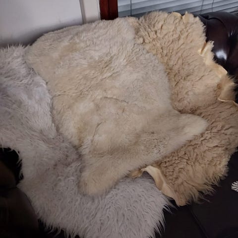 Taljat ovat islanninlammasta ja olleet vain somistuskäytössä tuolien selkänojalla, nyt muuton myötä ei enää tarpeellisia.