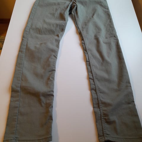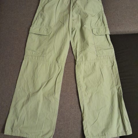 Vihreät housut koko 146. Toisessa lahkeessa huomaamaton minimaalinen reikä. Katso kuva.
