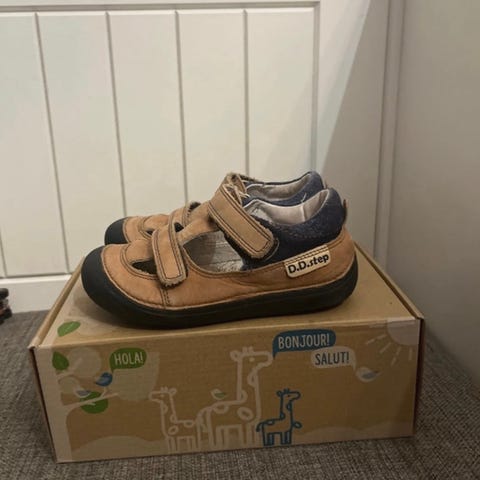 Kuin uudet, pari kertaa jalassa olleet lasten paljasjalkasandaalit kokoa 26 (sm 16,8cm). Väriltään ruskea/sininen.