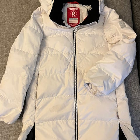 Reima lasten untuvatakki, koko 146, väri valkoinen, materiaali untuva/höyhen, unisex-malli. Takissa on hupullinen malli ja vetoketjukiinnitys. Helmassa ja hihoissa kangas imenyt likaa ja pientä värihaittaa (ks. kuva): Soveltuu lasten käyttöön kylmiin olosuhteisiin.