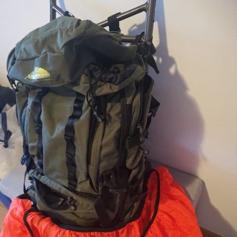 Vihreä rinkka 70 l, jossa pehmustetut olkaimet ja vyötärövyö tukemaan kantamista. Repussa useita taskuja ja kiristysremmejä tavaroiden kiinnittämiseen ja säätämiseen. Sopii retkeilyyn ja ulkoiluun.