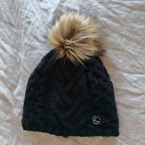 Myynnissä harmaaraidallinen villa/akryylipipo tupsulla.