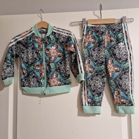 Paljon käytetty Adidaksen ihana verkka-asu koossa 80. Tummentumaa löytyy resoreista ja housujen haarasauma jo kulunut. Kuitenkin oikein käyttökelpoinen ja kaunis asu hiekkalaatikkohommiin.