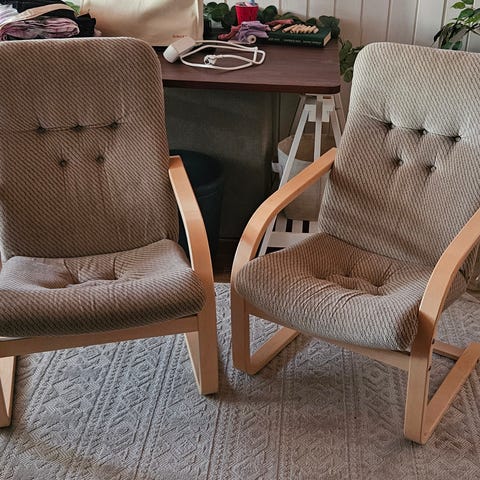 Myydään 2kpl puurunkoisia nojatuoleja. Ehjät ja ikäisekseen siistit. Helposti myös uudelleen verhoiltavissa. Hinta 30e/kpl.