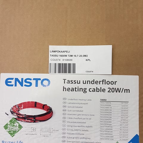 Ensto TASSU sähkövastuskaapeli, pituus 25 metriä, halkaisija 4,9 mm, väri punainen. Kaapeli on kaksijohtiminen ja soveltuu lattialämmitykseen. Lämmitysteho 20 W/m, kokonaisteho 500 W. Kaapeli kestää asennuslämpötilan alimmillaan -10 °C. Liitäntäkaapelin pituus 3,0 m. Tuotteen valmistusmaa on Puola.
