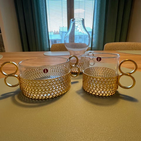 Nämä ovat Timo Sarpanevan Iittalalle suunnittelemia Karaatti-sarjan laseja kullanvärisillä metallipitimiillä.