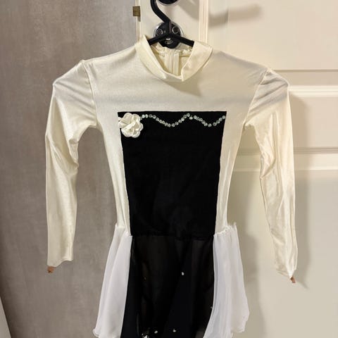 Kisoissa käytetty taitoluistelumekko, ollut 2-3 kisoissa päällä. Suunniteltu ja tilaustyönä tehty uutena yksilöllisesti kisoja varten. Koko arviolta 134-140cm.