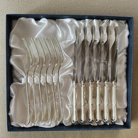 Kultakeskuksen valmistamat Chippendalen hopeiset aterimet, 24 osaa laatikossa.