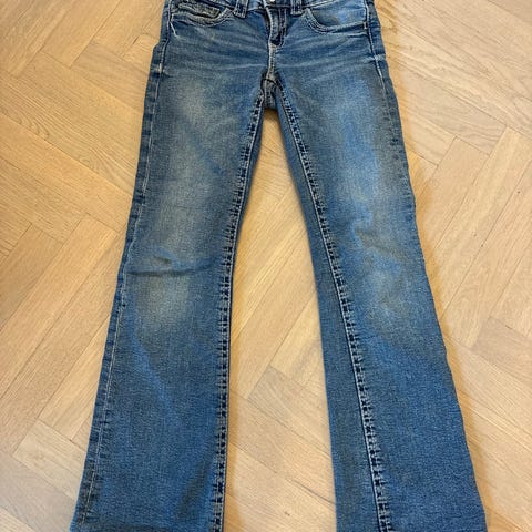 Tyylikkäät siniset farkut koristeellisilla takataskuilla ja kevyesti kulutetulla pinnalla. Klassinen viisitaskumalli, levenevä lahje ja säädettävä vyötärö. Ei tahroja, ei kulumia – siistit ja ehjät.