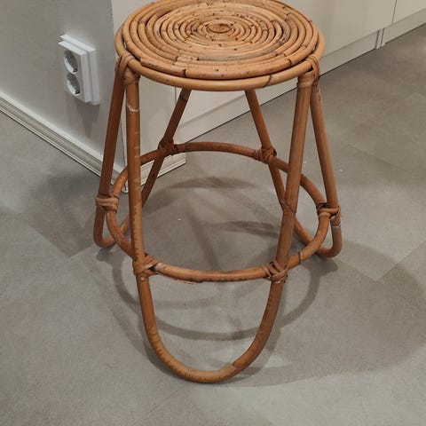 Rottinkin kolmeosainen kukkajalka. Saranoilla saa säädettyä leveyttä. Tyydyttävässä kunnossa, on kulumaa ja kahden korin ympäriltä koristereunus osin irronnut.