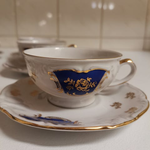 Hakusanat: sininen, punainen, posliini, saksalainen, teekupit, bavaria, winterling, Paketoitava, Valmistaja, kultakoristeet, 1960-luku