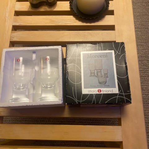 Moreeni-snapsilasit, Heikki Orvolan suunnittelemat. Laseja 6 kpl, ehjät. Lasin korkeus n. 8cm, halkaisija 4cm. Nouto joko Kirkkonummelta tai Leppävaarasta.