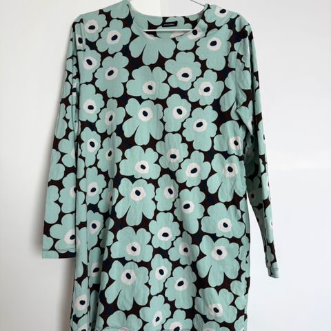 Ujuma Marimekon tunika. Kirkkaat värit, valkoinen ja sininen.