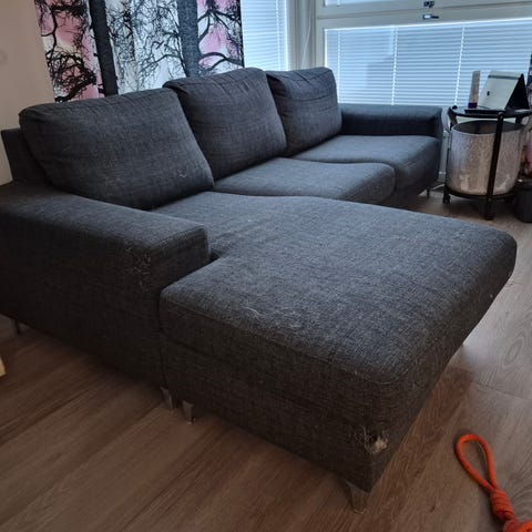 Pehmeä 3-hengen divaanisohva. Jouset väsyneet divaaniosan nurkkapaikalla. Kangas ehjä. Ei haise, ei karvoja. Muuten siistikuntoinen.