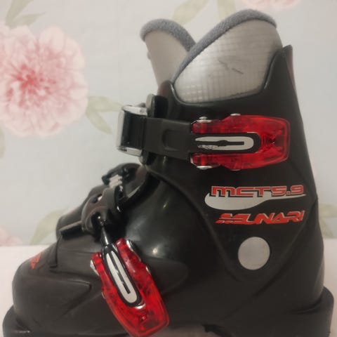 Lasten laskettelumonot kokoa 17,5cm eli noin koko 27-28. Sisävuoritus ja kiinnitysklipsut täysin ehjät, mutta ulkokuoressa joitain pieniä naarmuja ja sivusta lohjennut pienet muovin palaset monon yläreunasta (katso lisäkuva), mikä ei kuitenkaan haittaa käyttöä millään tavalla.